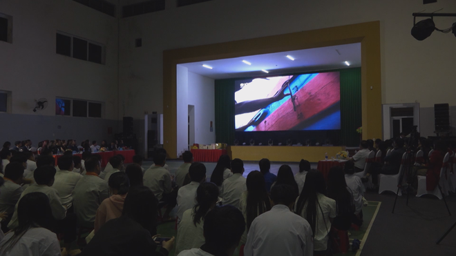 Toàn cảnh hội trường nơi các bạn trẻ chăm chú theo dõi phóng sự về những rủi ro nguy hiểm trên hành trình di cư bằng đường biển