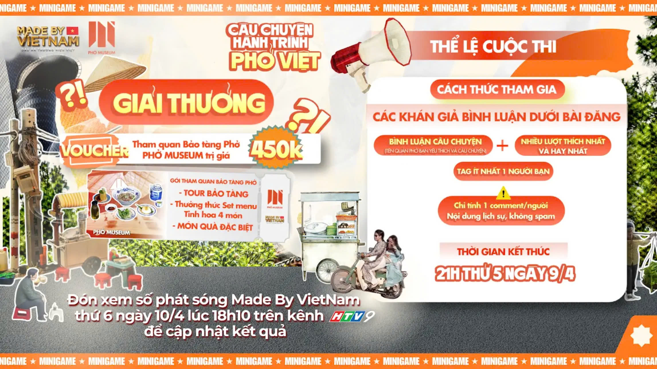 Cuộc thi "Câu chuyện hành trình Phở Việt" được tổ chức bằng hình thức bình luận trực tuyến dưới bài đăng chính thức của chương trình. Người tham gia chia sẻ câu chuyện, kỷ niệm hoặc cảm xúc về Phở Việt, đồng thời gắn thẻ ít nhất một người bạn trong phần bình luận. Ban tổ chức sẽ lựa chọn những bình luận hay, ý nghĩa và nhận được nhiều lượt thích để trao giải. Mỗi người được tính một bình luận hợp lệ, nội dung lịch sự, không spam.