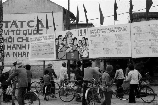 Chuẩn bị cho ngày bầu cử, Quận Đống Đa vẽ pano, áp phích, khẩu hiệu cộ động và niêm yết danh sách ứng viên đại biểu Quốc hội khóa VIII và HĐND ở những nơi công cộng để nhân dân tìm hiểu, nghiên cứu (Hà Nội, 19/4/1987). Ảnh: Trần Tuấn/TTXVN