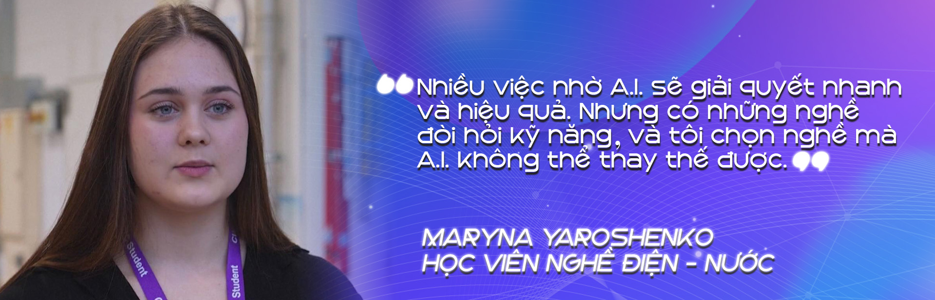 Ở tuổi 18, Maryna Yaroshenko - một học viên người Anh, đã quyết định theo học nghề điện - nước thay vì tiếp tục con đường đại học vốn được xem là "chuẩn mực" cho tương lai. Lý do là sự cạnh tranh khốc liệt từ A.I. trong các ngành văn phòng.