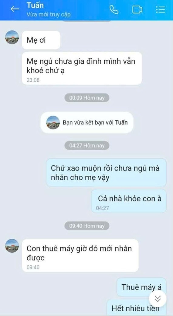 Qua tin nhắn, chị Huyên được "con trai" cho biết, do trong thời gian huấn luyện chiến sĩ mới đơn vị không cho phép sử dụng điện thoại di động nên phải thuê điện thoại bên ngoài để liên lạc về nhà, bởi vậy tên Zalo mới là "Tuấn" và phải liên lạc vào ban đêm. Cũng vì phải thuê điện thoại nên "con trai" đã khéo léo dẫn dắt, gợi ý chị Huyên gửi tiền để trả... Cách nói chuyện khác lạ của "con trai" khiến chị Huyên nghi ngờ. Để kiểm tra, xác minh, chị yêu cầu gọi điện video nhưng đối tượng lấy cớ sợ cán bộ đơn vị phát hiện nên từ chối.
