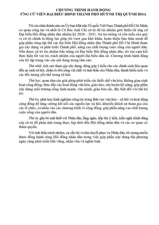 Chương trình hành động Ứng cử viên Đại biểu Hội đồng nhân dân TP. Hồ Chí Minh Khóa XI Huỳnh Thị Quỳnh Hoa