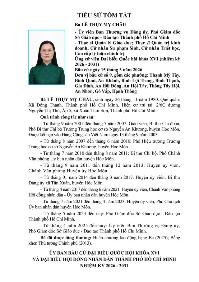 (HTV) - Bà Lê Thụy Mỵ Châu ứng cử Đại biểu Quốc hội Khóa XVI tại Đơn vị bầu cử số 9 TP. Hồ Chí Minh, gồm các Phường: Thạnh Mỹ Tây, Bình Quới, An Khánh, Bình Lợi Trung, Bình Thạnh, Gia Định, An Hội Đông, An Hội Tây, Thông Tây Hội, An Nhơn, Gò Vấp, Hạnh Thông