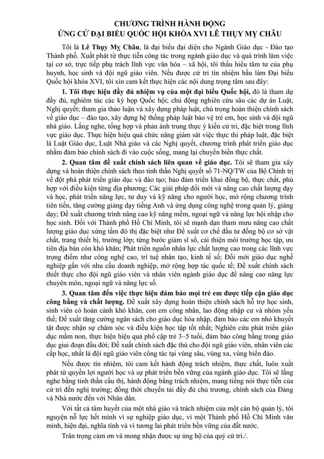 Chương trình hành động Ứng cử viên Đại biểu Quốc hội Khóa XVI Lê Thụy Mỵ Châu