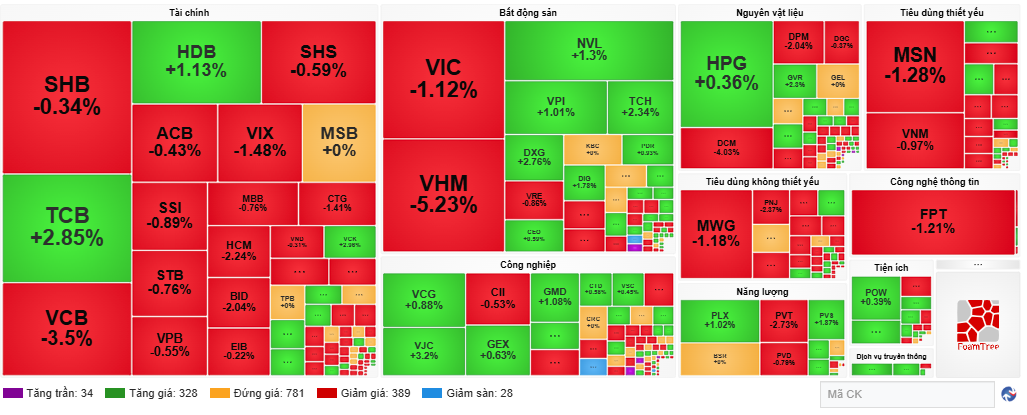 Áp lực lớn nhất đến từ nhóm vốn hóa lớn. Trong đó, bộ đôi VIC và VHM lấy đi nhiều điểm số nhất của VN-Index, riêng VHM giảm mạnh tới hơn 5%. Nhóm ngân hàng cũng giao dịch tiêu cực với hàng loạt mã như VCB, BID, CTG, MBB giảm điểm, dù vẫn có một số điểm sáng như TCB, HDB tăng giá.