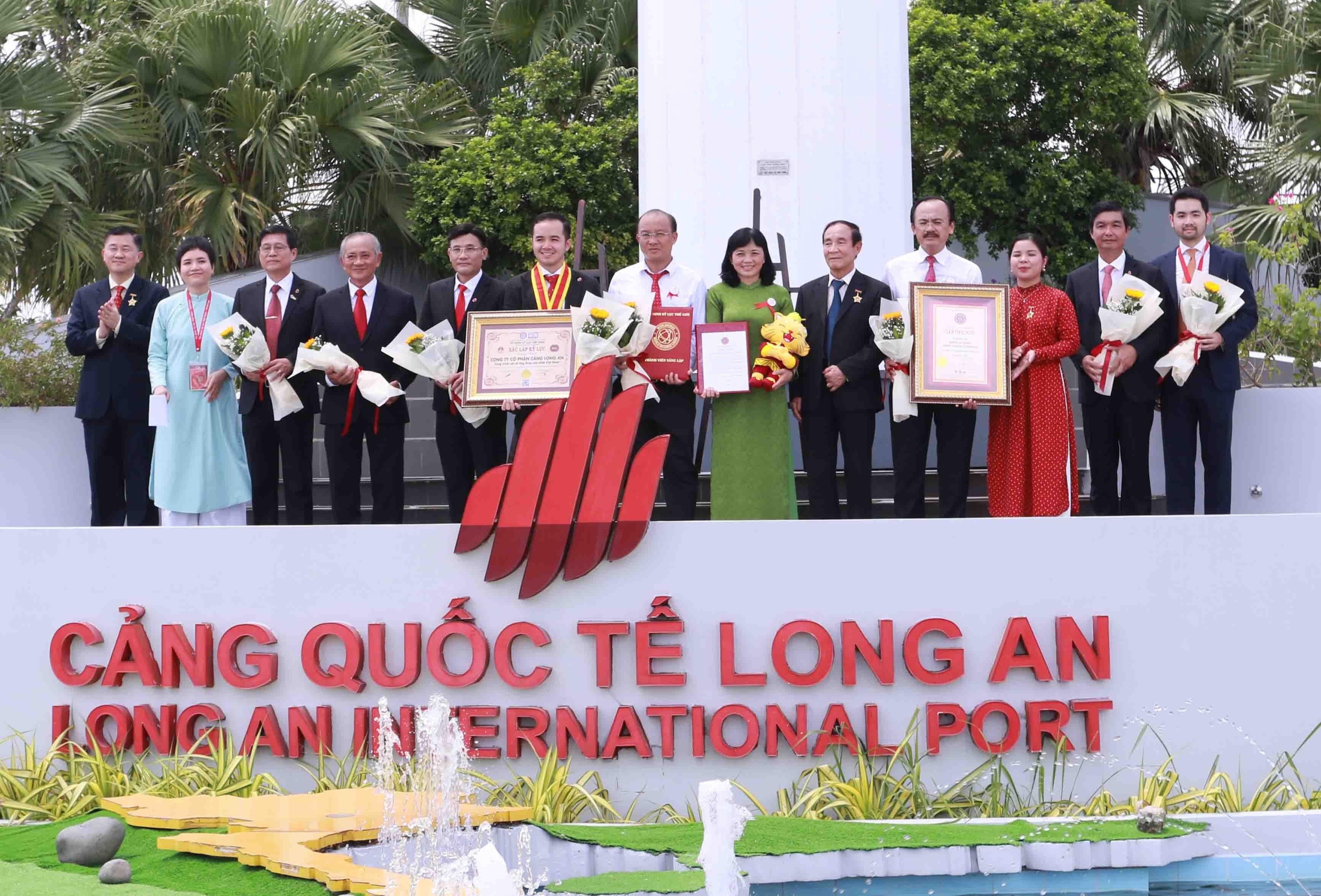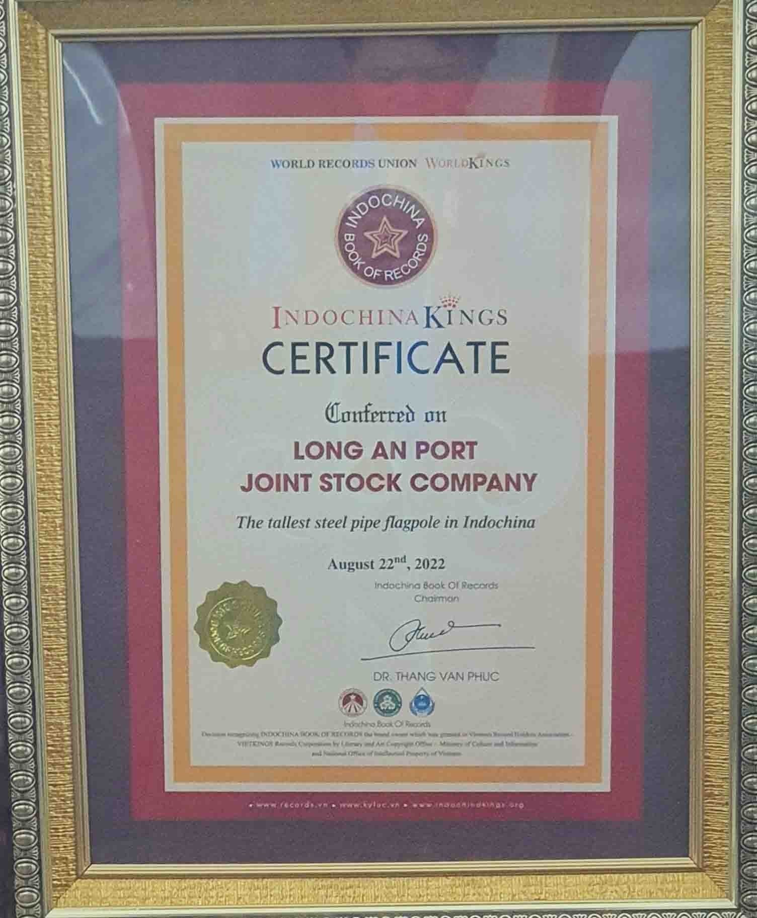 Ban lãnh đạo Công ty Cổ phần Cảng Long An thuộc Đồng Tâm Group nhận Bằng xác lập kỷ lục cột cờ cao nhất khu vực Đông Dương từ Tổ chức Kỷ lục Việt Nam