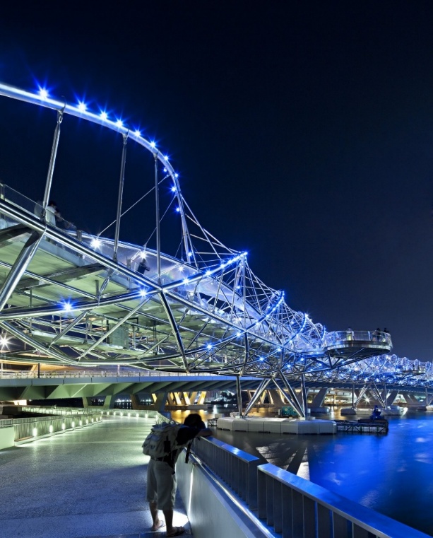 Điểm đặc biệt của cây cầu nằm ở thiết kế xoắn kép lấy cảm hứng từ hình dáng cấu trúc DNA. Những khung thép uốn lượn tạo nên một hình dáng vừa mềm mại vừa hiện đại, như một tác phẩm nghệ thuật giữa không gian mở. Nếu bạn ghé qua sau hoàng hôn, bạn sẽ được ngắm nhìn hệ thống đèn LED trang bị dọc theo cấu trúc xoắn thắp sáng cả một vùng, kiến tạo một khung cảnh lung linh, rất đặc trưng của Singapore hoa lệ.