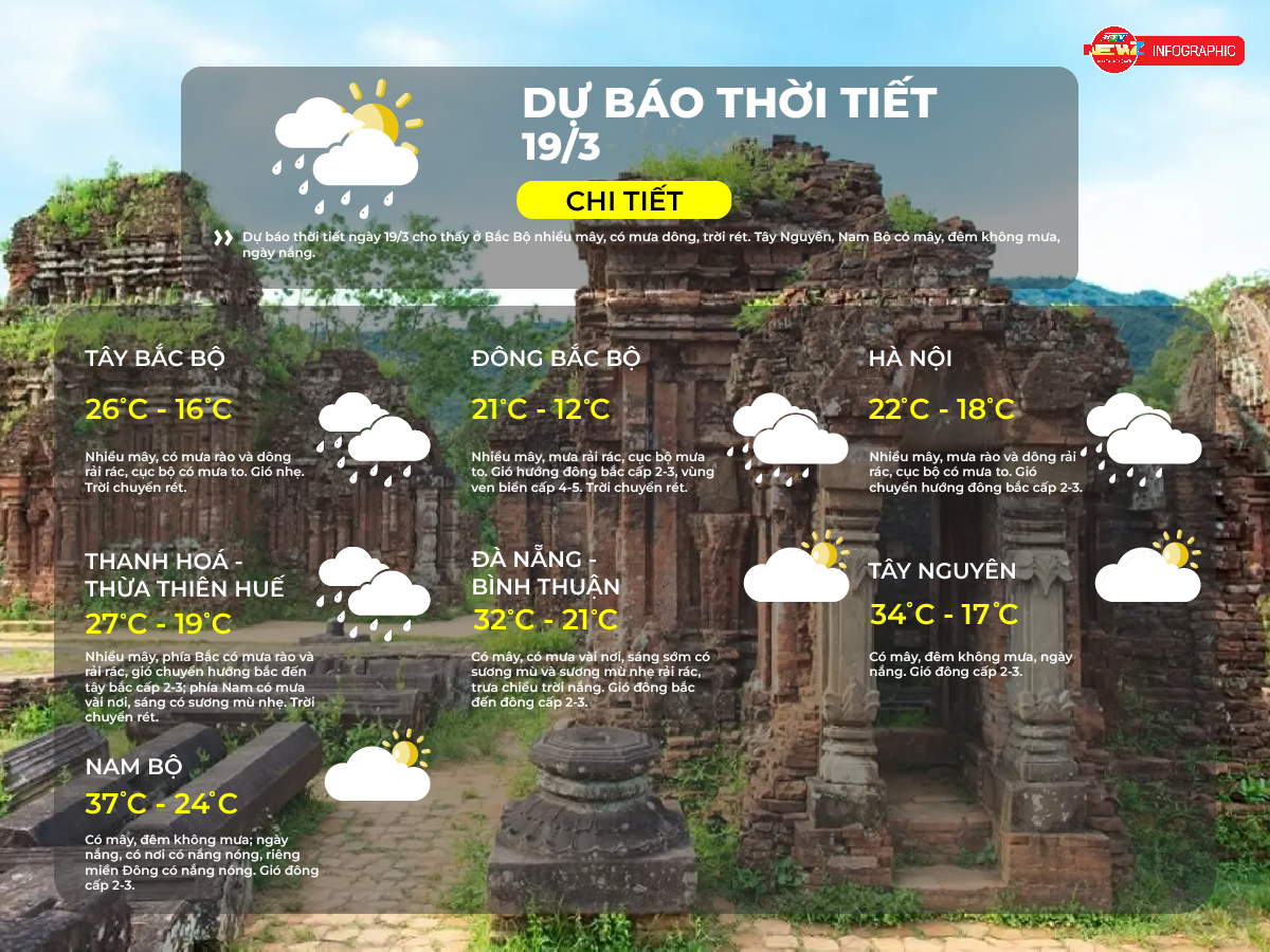 Sáng ngày 19/3, trời có mây và nắng xen kẽ từng đợt, giữa trưa lượng UV cao nhất ở mức 6 - nguy hại. Nhiệt độ trong khoảng 26oC đến 34oC. Độ ẩm không khí trung bình 57%. Gió cấp 1, giật cấp 3, vận tốc 15-33km/h hướng Đông.