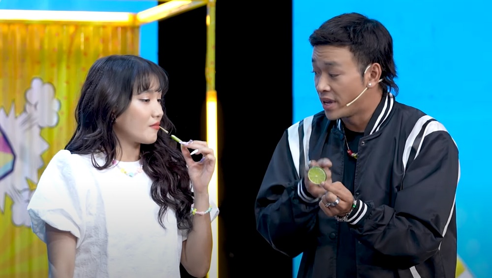 Đáng chú ý là trong trò chơi “Nhìn hình đoán từ”, Hoàng Phi - Emma Nhất Khanh đặt hết hy vọng cho câu hỏi cuối cùng, tự tin cá cược với đội bạn. Song, may mắn vẫn chưa mỉm cười, cả hai được thưởng hẳn một “Hamburger 7 lát chanh”. Hoàng Phi còn bày đồng đội đọc thần chú: “Chanh này ngọt lắm, chanh này ngọt lắm” và cái kết cả hai đều “ngọt đến nhăn mặt”.