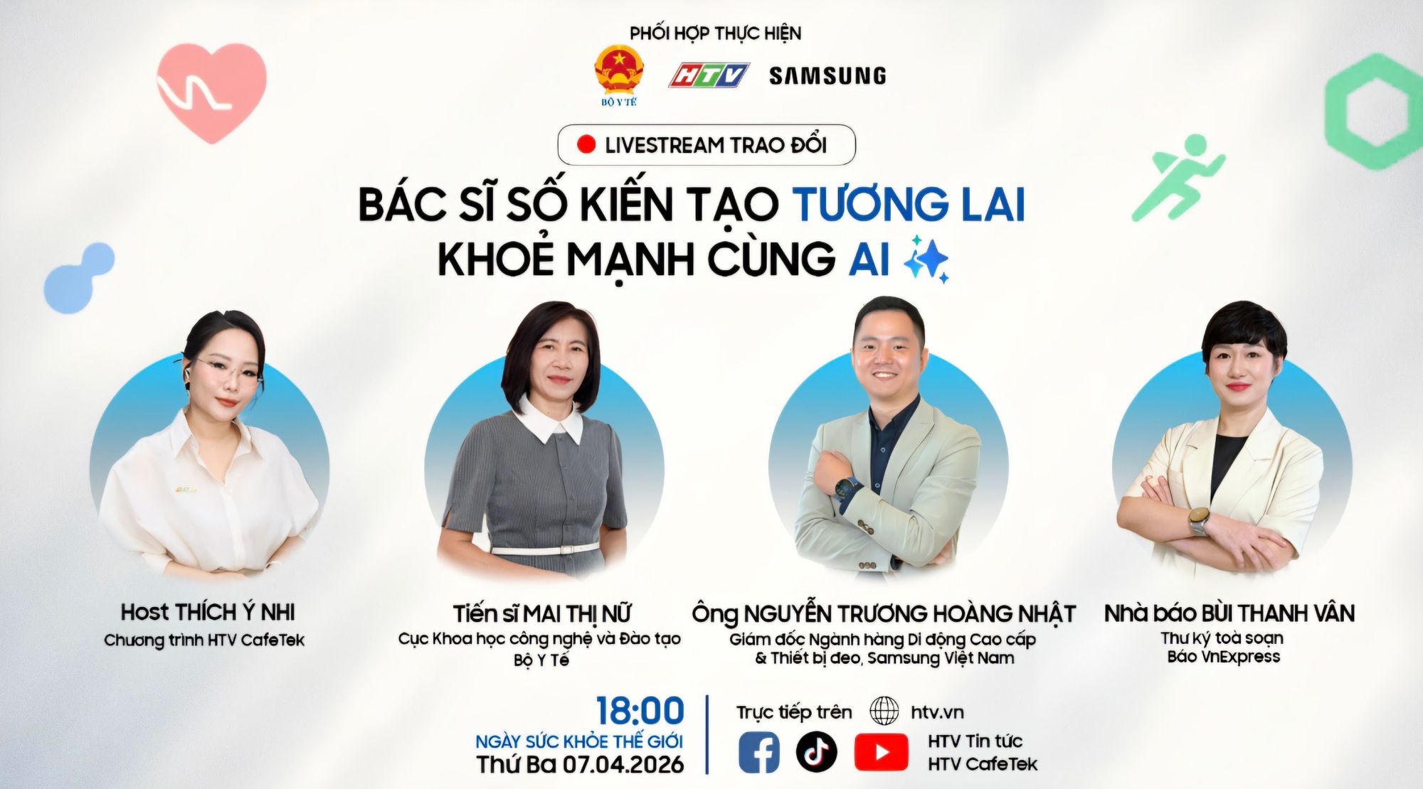 Buổi livestream trao đổi có sự tham gia của Tiến sĩ Mai Thị Nữ - Cục Khoa học công nghệ và Đào tạo, Bộ Y tế; Nhà báo Bùi Thanh Vân - Thư ký Tòa soạn Báo VnExpress; và Ông Nguyễn Trương Hoàng Nhật - Giám đốc Ngành hàng Di động Cao cấp & Thiết bị đeo tại Công ty Điện tử Samsung Việt Nam và được dẫn dắt bởi Biên tập viên Thích Ý Nhi - Giám đốc sản xuất khối chương trình đa truyền thông HTV CafeTek