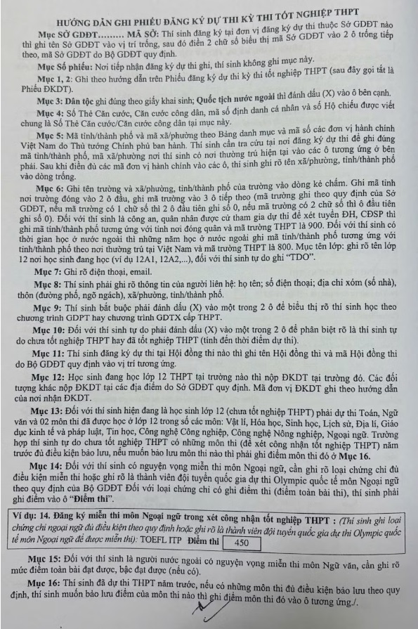 Trước khi khai phiếu đăng ký dự thi, thí sinh cần đọc kỹ các mục và bản hướng dẫn ghi phiếu, những điểm nào chưa rõ thí sinh phải hỏi người tiếp nhận đăng ký dự thi để được hướng dẫn đầy đủ.