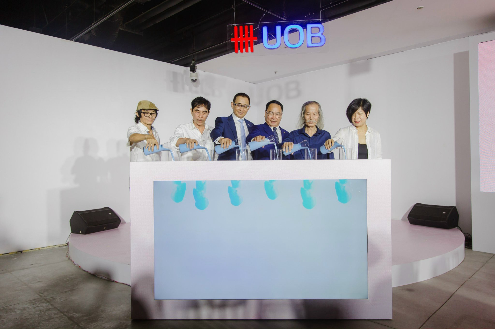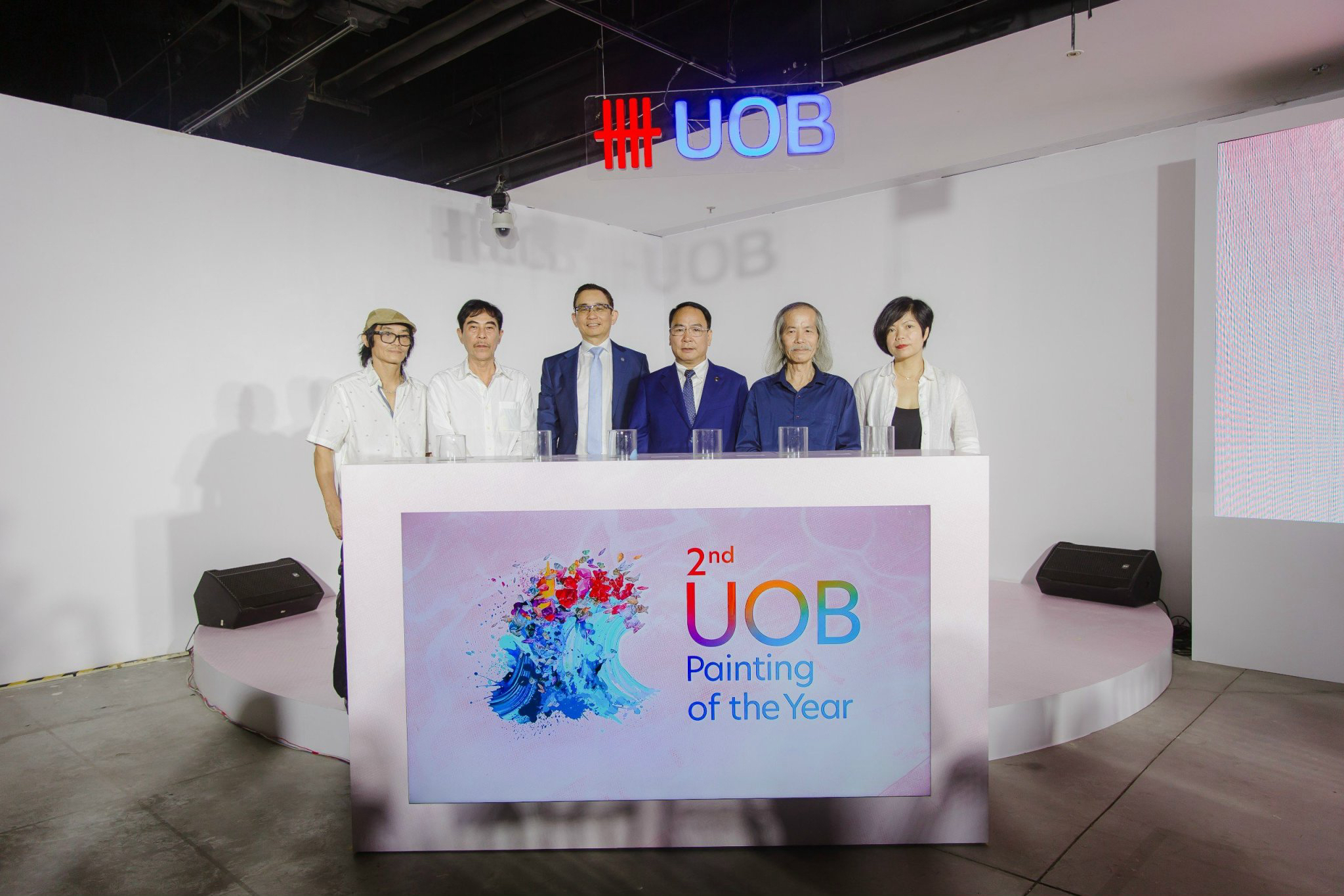 Từ trái sang phải: Nghệ sĩ Trịnh Tuân, Nghệ sĩ Đặng Xuân Hòa, Ông Victor Ngo, Ông Mã Thế Anh, Nghệ sĩ Lương Xuân Đoàn, Nghệ sĩ Châu Giang thực hiện nghi thức khai mạc cuộc thi UOB Painting of the Year năm thứ hai tại Việt Nam
