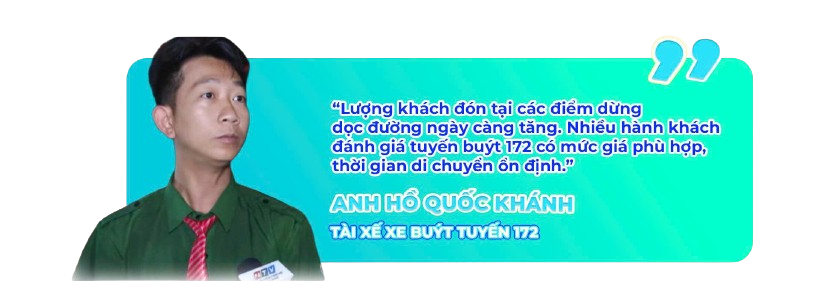 Tuyến buýt 172 có lộ trình dài gần 100 km, thời gian di chuyển từ Vũng Tàu đến bến xe Sài Gòn khoảng 2 đến 2,5 giờ. Hiện tại, tuyến xe này đã đi vào vận hành ổn định,đạt 38 chuyến/ngày/đầu bến. Trước nhu cầu đi lại dự báo sẽ tiếp tục tăng dịp cận Tết Nguyên đán, đơn vị khai thác hiện đã có phương án tăng chuyến, sẵn sàng điều chỉnh tần suất để đáp ứng nhu cầu người dân.