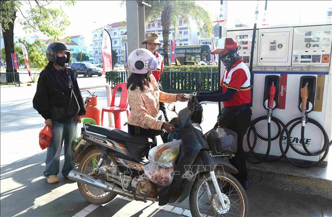 Người dân đến đổ xăng tại một cửa hàng xăng dầu ở thành phố Stung Treng, tỉnh Stung Treng, Đông Bắc Campuchia. Ảnh: Huỳnh Thảo/PV TTXVN tại Campuchia