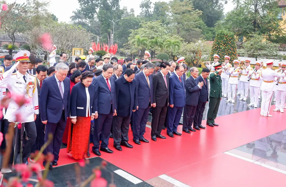Các đồng chí lãnh đạo, nguyên lãnh đạo Đảng, Nhà nước dâng hương, tưởng niệm các Anh hùng Liệt sĩ, sáng 13/2. Ảnh: VIẾT CHUNG