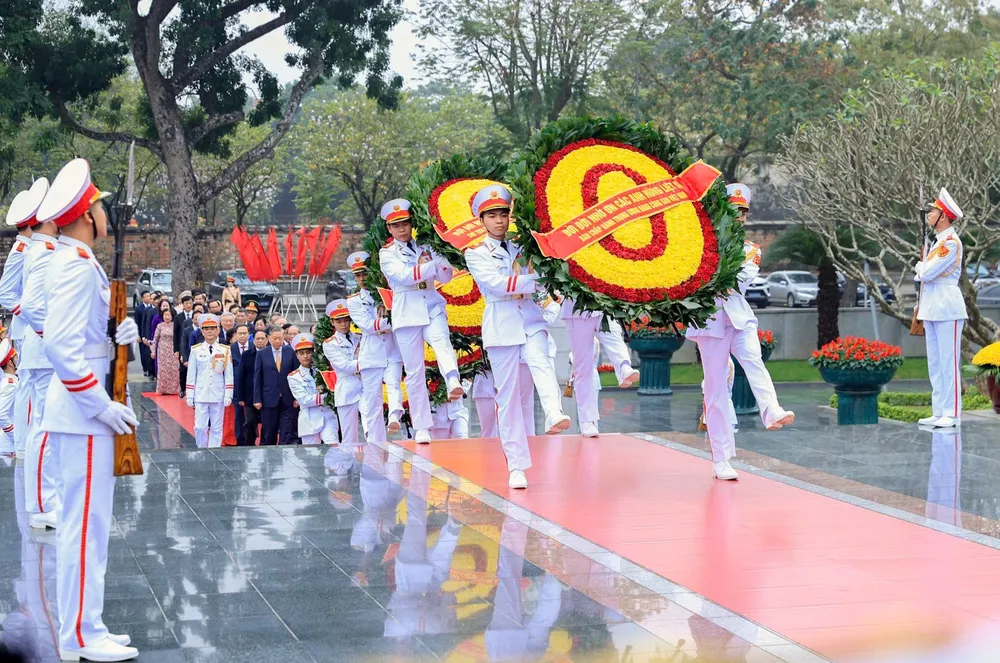 Các đồng chí lãnh đạo, nguyên lãnh đạo Đảng, Nhà nước đến đặt vòng hoa và vào Lăng viếng Chủ tịch Hồ Chí Minh nhân dịp Tết Nguyên đán Bính Ngọ năm 2026, sáng 13/2. Ảnh: QUANG PHÚC