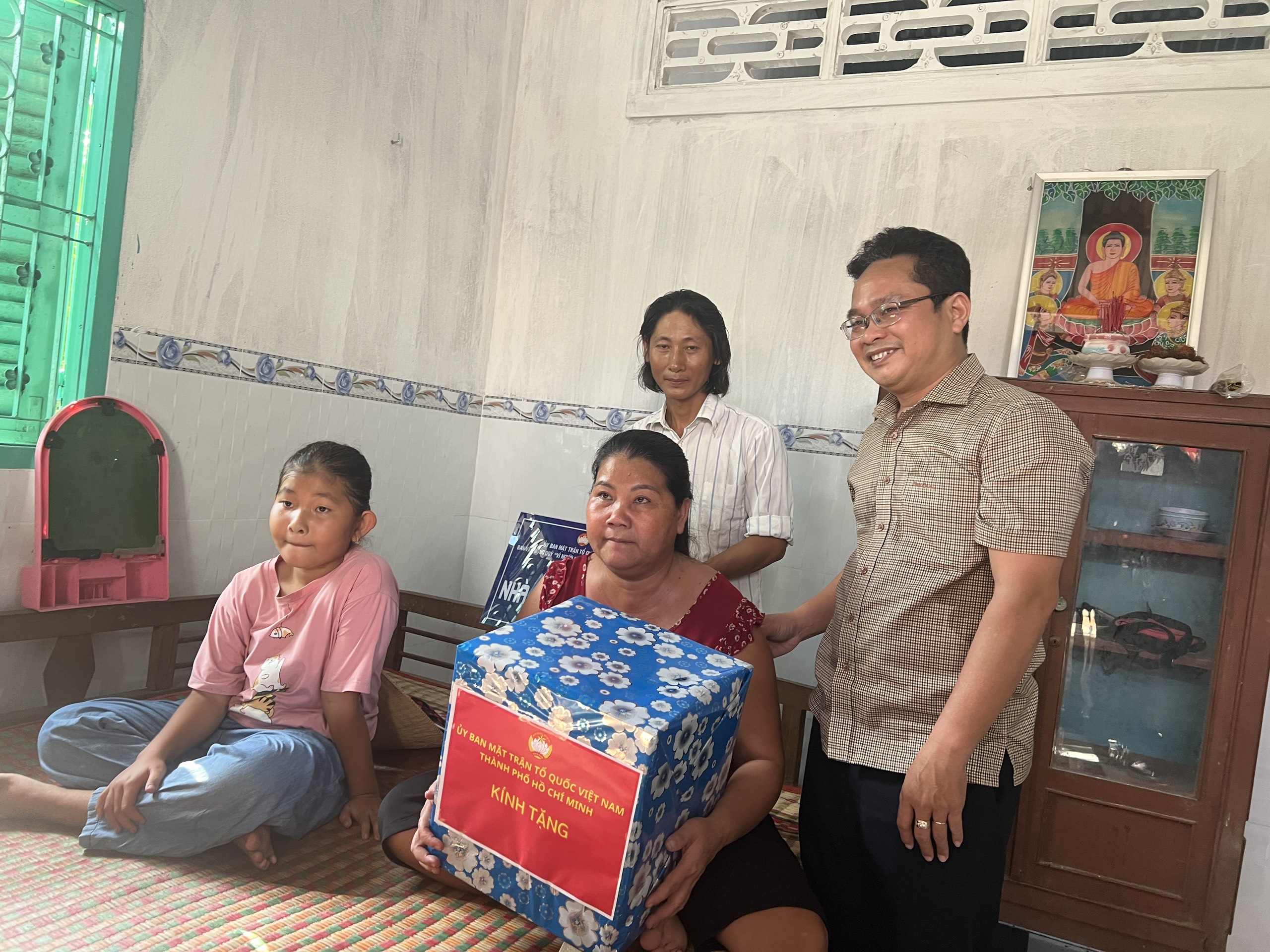 Phó Chủ tịch Uỷ ban MTTQ Việt Nam TP.HCM Phạm Minh Tuấn tặng quà cho gia đình anh Kiên Khe Ma Rinh
