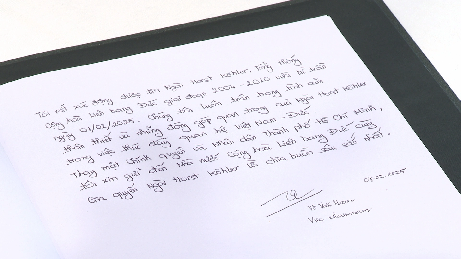 Gửi lời chia buồn sâu sắc đến Chính phủ và nhân dân Cộng hòa Liên bang Đức, trong sổ tang, Phó Chủ tịch UBND TP.HCM Võ Văn Hoan bày tỏ sự tiếc thương và trân trọng những đóng góp quan trọng của cố Tổng thống Horst Köhler trong việc thúc đẩy quan hệ Việt Nam - Đức.