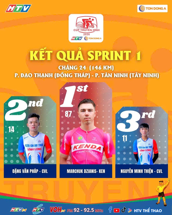 Khi tiến vào những km cuối cùng tại Tây Ninh, Marchuk Dzianis đã tung ra một cú nước rút thần tốc, loại bỏ hoàn toàn các đối thủ cạnh tranh để cán đích đầu tiên, giành chiến thắng chặng 24 đầy thuyết phục. Chiến thắng này không chỉ khẳng định đẳng cấp của Dzianis mà còn là thành quả xứng đáng cho tinh thần chiến đấu quả cảm của toàn đội Kenda Đồng Nai trên suốt lộ trình 146km đầy nắng và gió.