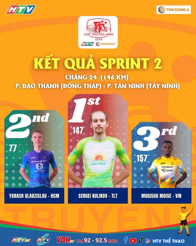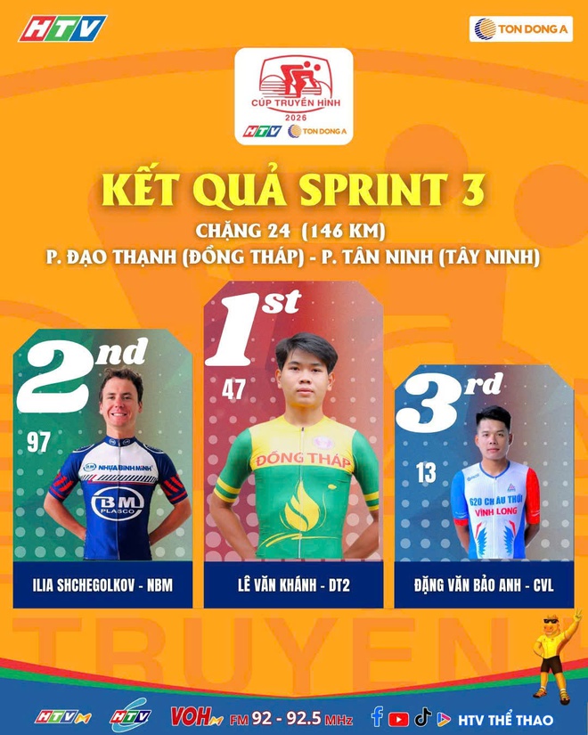 Chặng 24 của Cúp Truyền hình TP. Hồ Chí Minh 2026 từ Đồng Tháp đi Tây Ninh dài 146 km đã diễn ra với kịch bản đầy kịch tính, đánh dấu sự thống trị của các ngoại binh và những màn bứt phá tốc độ xé gió. Ngay từ những km đầu tiên, các đội đua đã liên tục tổ chức tấn công, đẩy tốc độ đoàn đông lên rất cao để tranh chấp các điểm thưởng dọc đường.