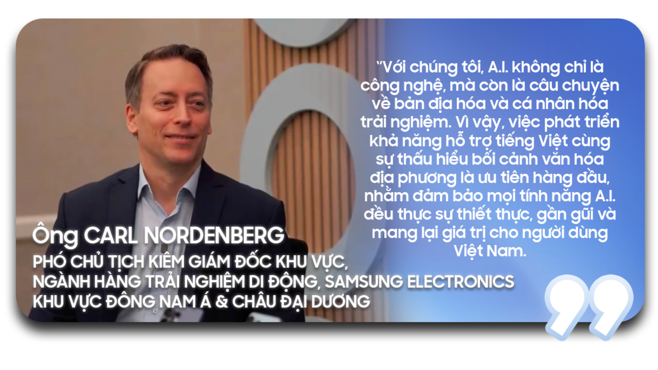 Ông Carl Nordenberg - Phó Chủ tịch kiêm Giám đốc Khu vực, Ngành hàng Trải nghiệm Di động, Samsung Electronics Đông Nam Á và Châu Đại Dương: "Việt Nam là một thị trường đặc biệt quan trọng đối với chúng tôi, không chỉ trong khu vực mà còn trên phạm vi toàn cầu, cả về đổi mới sáng tạo lẫn tiềm năng tăng trưởng dài hạn. Đây là một thị trường năng động, phát triển nhanh, với dân số trẻ luôn sẵn sàng đón nhận những xu hướng và công nghệ mới, đặc biệt là A.I.