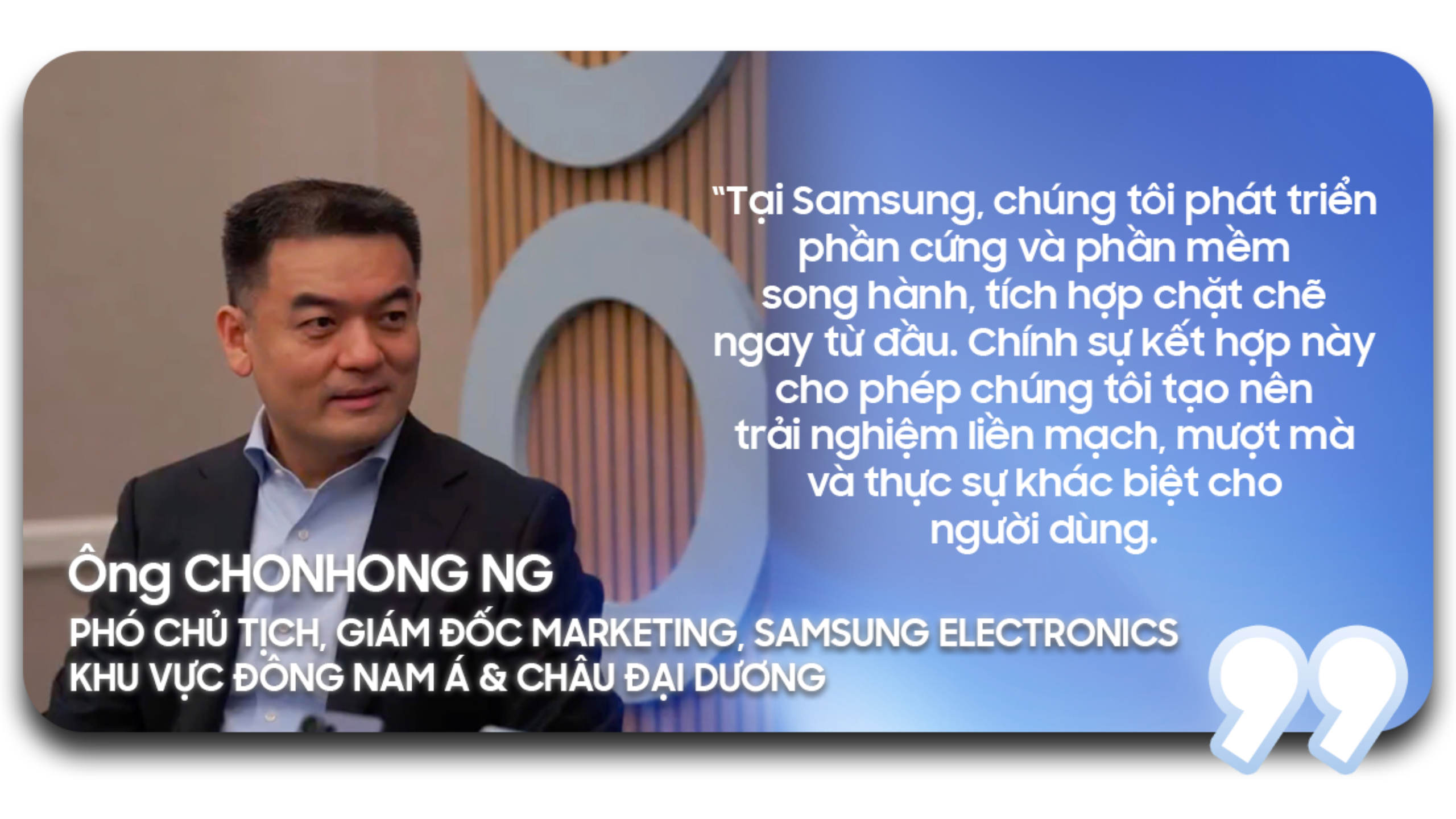 Ông ChonHong Ng - Phó Chủ tịch, Giám đốc Marketing, Samsung Electronics khu vực Đông Nam Á & Châu Đại Dương: “Theo quan điểm của chúng tôi, A.I. và phần cứng có vai trò quan trọng ngang nhau. Khi A.I. ngày càng trở nên thiết yếu, vai trò của phần cứng cũng càng được nâng cao, bởi người dùng kỳ vọng thiết bị phải mang lại hiệu suất ổn định, đáng tin cậy, phản hồi nhanh và mượt mà.