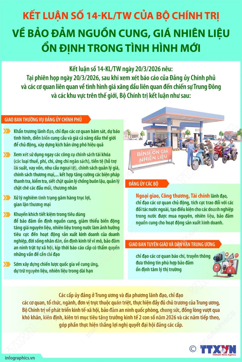 Việt Nam không tránh khỏi biến động chung này. Trong bối cảnh đó, Bộ Chính trị đã ban hành Kết luận số 14-KL/TW ngày 20/3/2026 về bảo đảm nguồn cung, ổn định giá nhiên liệu trong tình hình mới. Kết luận này được đưa ra trong một thời điểm đặc biệt nhạy cảm và rủi ro với thị trường năng lượng toàn cầu vốn đang chịu cú sốc lớn từ xung đột tại Trung Đông.