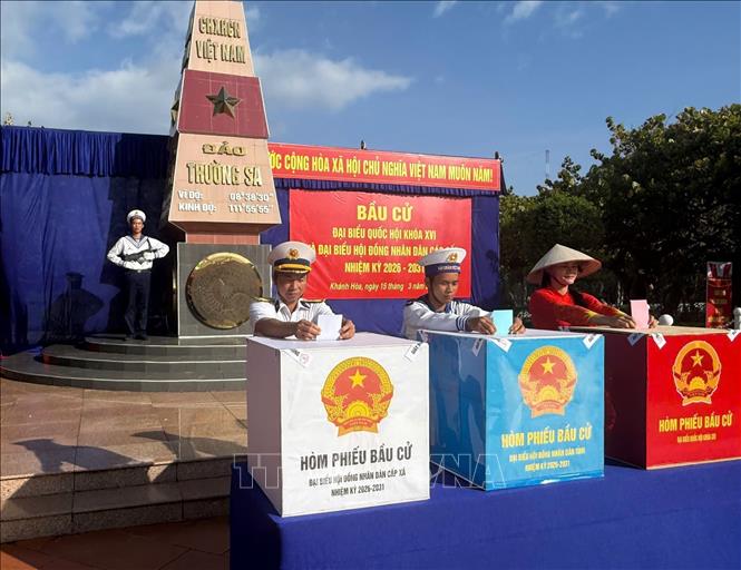 Cử tri đặc khu Trường Sa bỏ phiếu bầu cử Đại biểu Quốc hội khóa XVI và Đại biểu Hội đồng nhân dân các cấp nhiệm kỳ 2026 - 2031. Ảnh: TTXVN phát