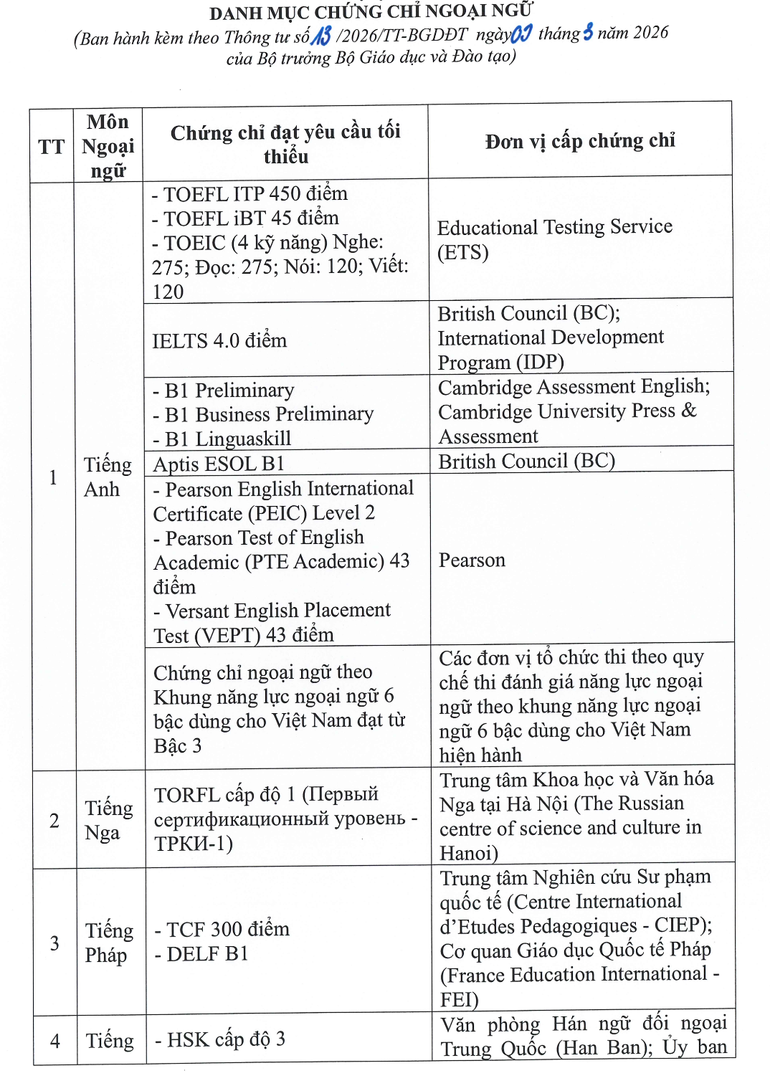 Theo danh mục chứng chỉ Ngoại ngữ vừa được cập nhật theo Thông tư số 13/TT-BGDĐT ngày 9/3/2026 về việc sửa đổi, bổ sung một số điều của Quy chế thi tốt nghiệp trung học phổ thông ban hành kèm theo Thông tư số 24/2024/TT-BGDĐT ngày 24/12/2024, có thêm chứng chỉ tiếng Hàn TOPIK và chứng chỉ tiếng Anh quốc tế Versant English Placement Test (VEPT).