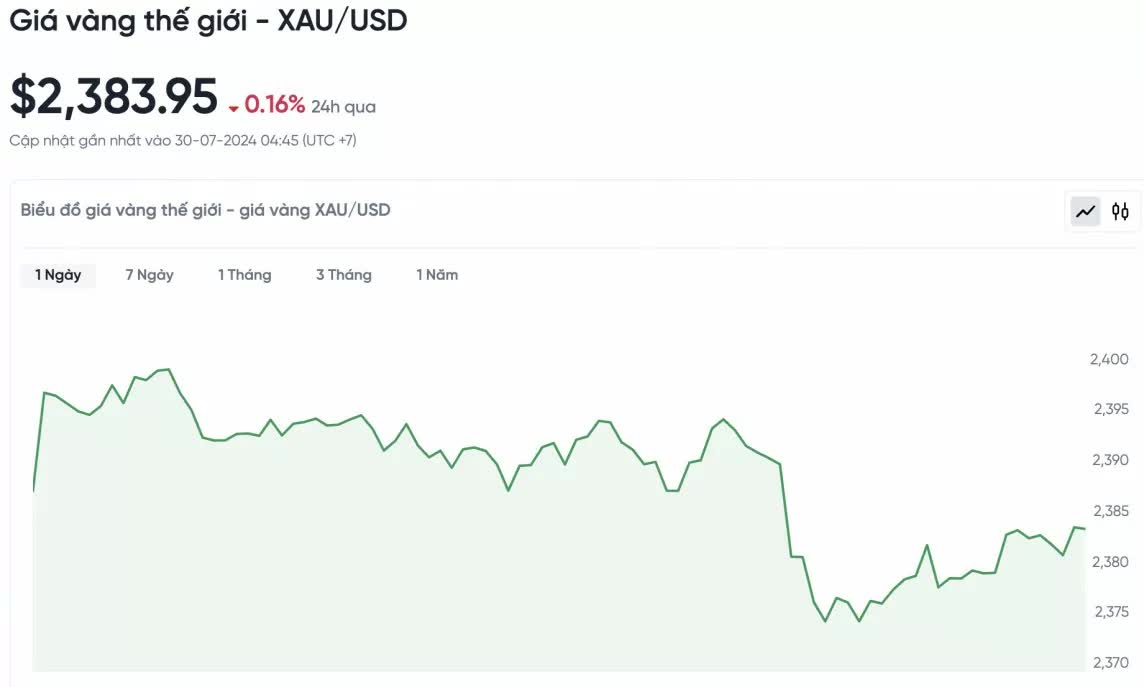 Theo Kitco, giá vàng thế giới ghi nhận lúc 5 giờ hôm nay theo giờ Việt Nam giao ngay ở mức 2.383,95 USD/ounce. Giá vàng hôm nay giảm 3,76 USD/ounce so với giá vàng ngày hôm qua. Quy đổi theo tỷ giá hiện hành tại Vietcombank, vàng thế giới có giá khoảng 71,847 triệu đồng/lượng (chưa tính thuế, phí). Như vậy, giá vàng miếng của SJC vẫn đang cao hơn giá vàng quốc tế là 5,653 triệu đồng/lượng.