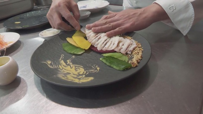 Nổi bật có món salad bạch tuộc được trang trí hình chú ngựa vàng tượng trưng cho may mắn và thịnh vượng.