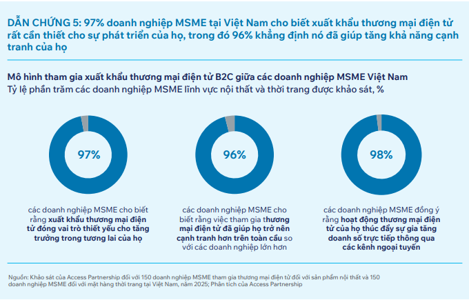 Theo nghiên cứu của Access Partnership, 97% doanh nghiệp MSME trong ngành nội thất và thời trang được khảo sát cho rằng xuất khẩu thương mại điện tử đóng vai trò thiết yếu cho tăng trưởng trong tương lai của họ, trong khi 96% ghi nhận việc ứng dụng thương mại điện tử giúp nâng cao năng lực cạnh tranh toàn cầu.