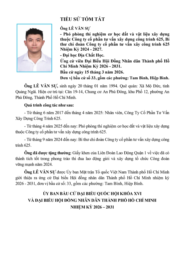 Tóm tắt tiểu sử ông Lê Văn Sự ứng cử Hội đồng nhân dân TP. Hồ Chí Minh Khóa XI