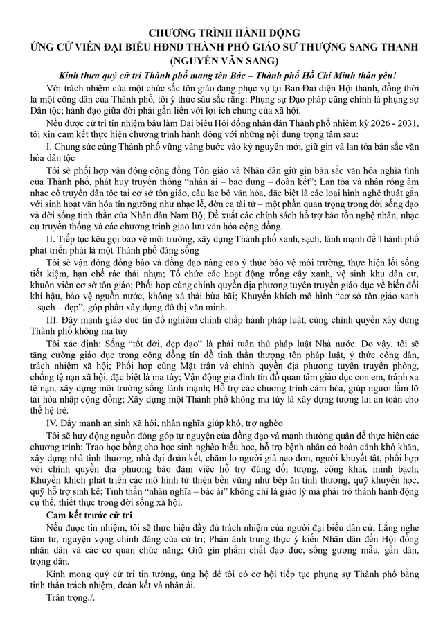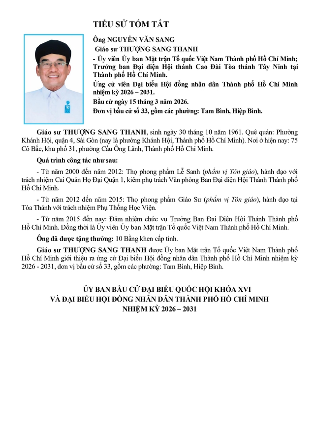 (HTV) - Ông Nguyễn Văn Sang ứng cử Hội đồng nhân dân TP. Hồ Chí Minh Khóa XI tại Đơn vị bầu cử số 33, gồm các phường: Tam Bình, Hiệp Bình.