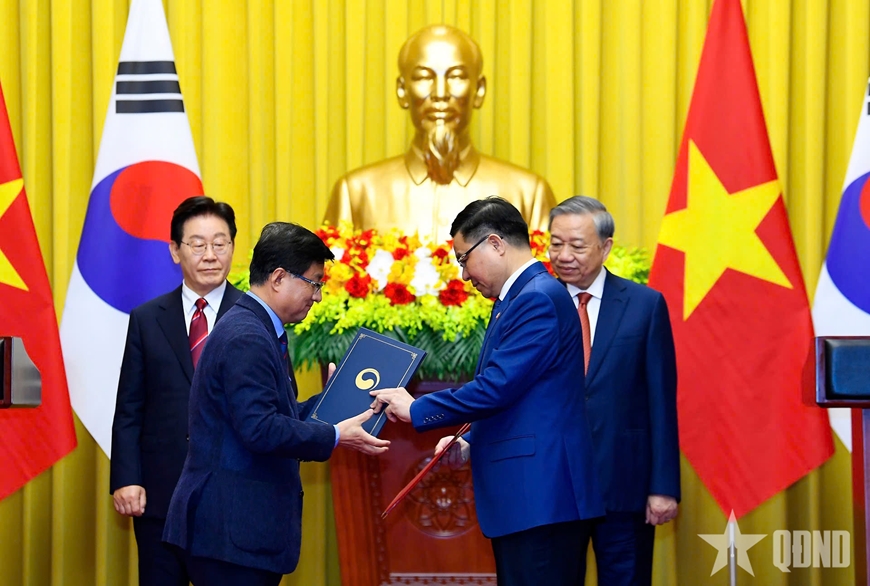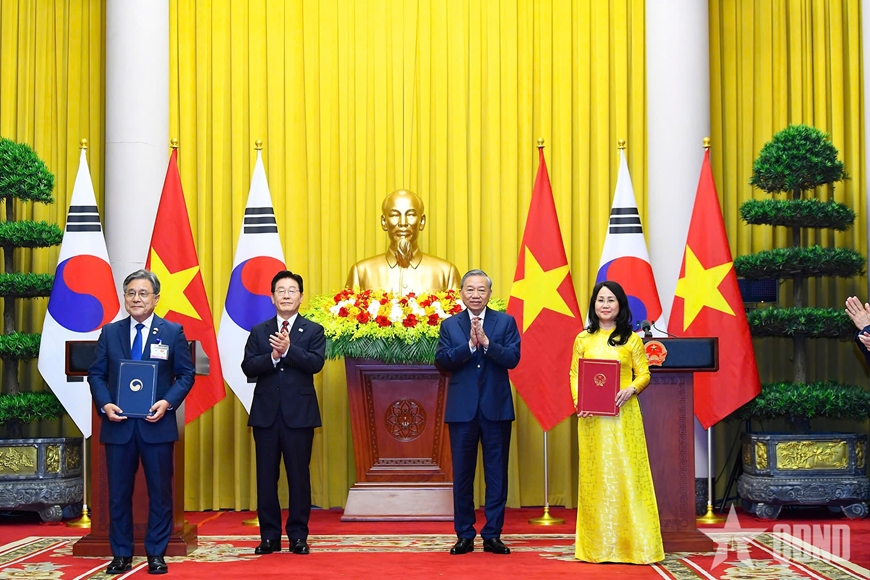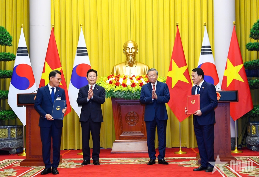 Tổng Bí thư, Chủ tịch nước Tô Lâm và Tổng thống Hàn Quốc Lee Jae Myung đã cùng chứng kiến lễ trao 12 văn bản thỏa thuận hợp tác trên nhiều lĩnh vực được ký kết giữa các bộ, ngành hai nước, thể hiện thành quả phong phú, toàn diện mà hai bên đạt được trong chuyến thăm lần này.