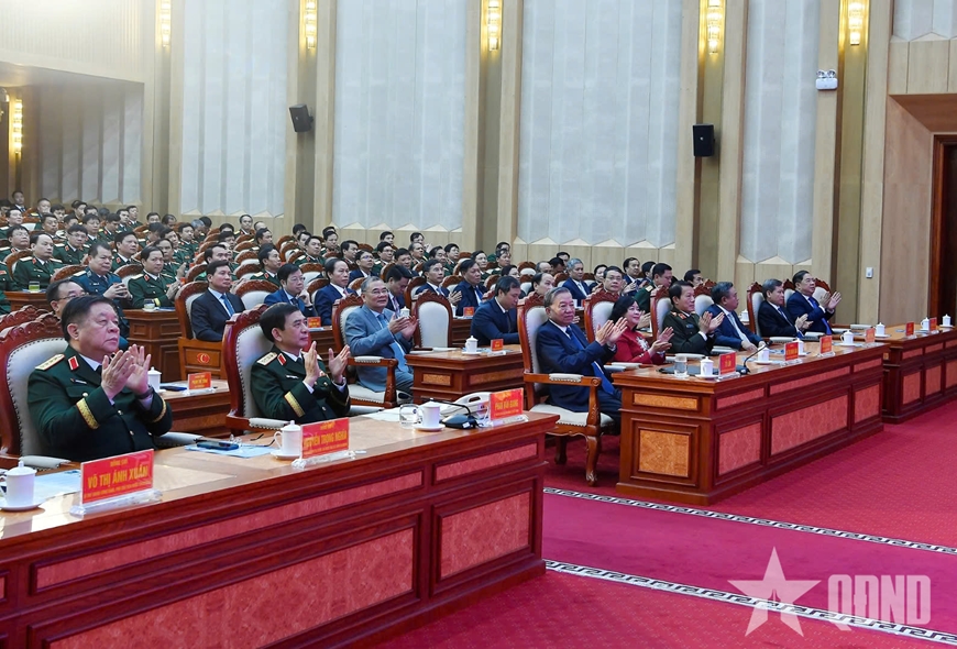 Phát biểu tại buổi lễ, thay mặt lãnh đạo Đảng, Nhà nước, Tổng Bí thư Tô Lâm gửi lời chúc tốt đẹp nhất đến toàn thể cán bộ, chiến sĩ, quân nhân chuyên nghiệp, công nhân và viên chức quốc phòng của Quân chủng Hải quân; chúc mừng những thành tích đặc biệt xuất sắc mà Hải quân nhân dân Việt Nam đạt được trong thời gian qua.