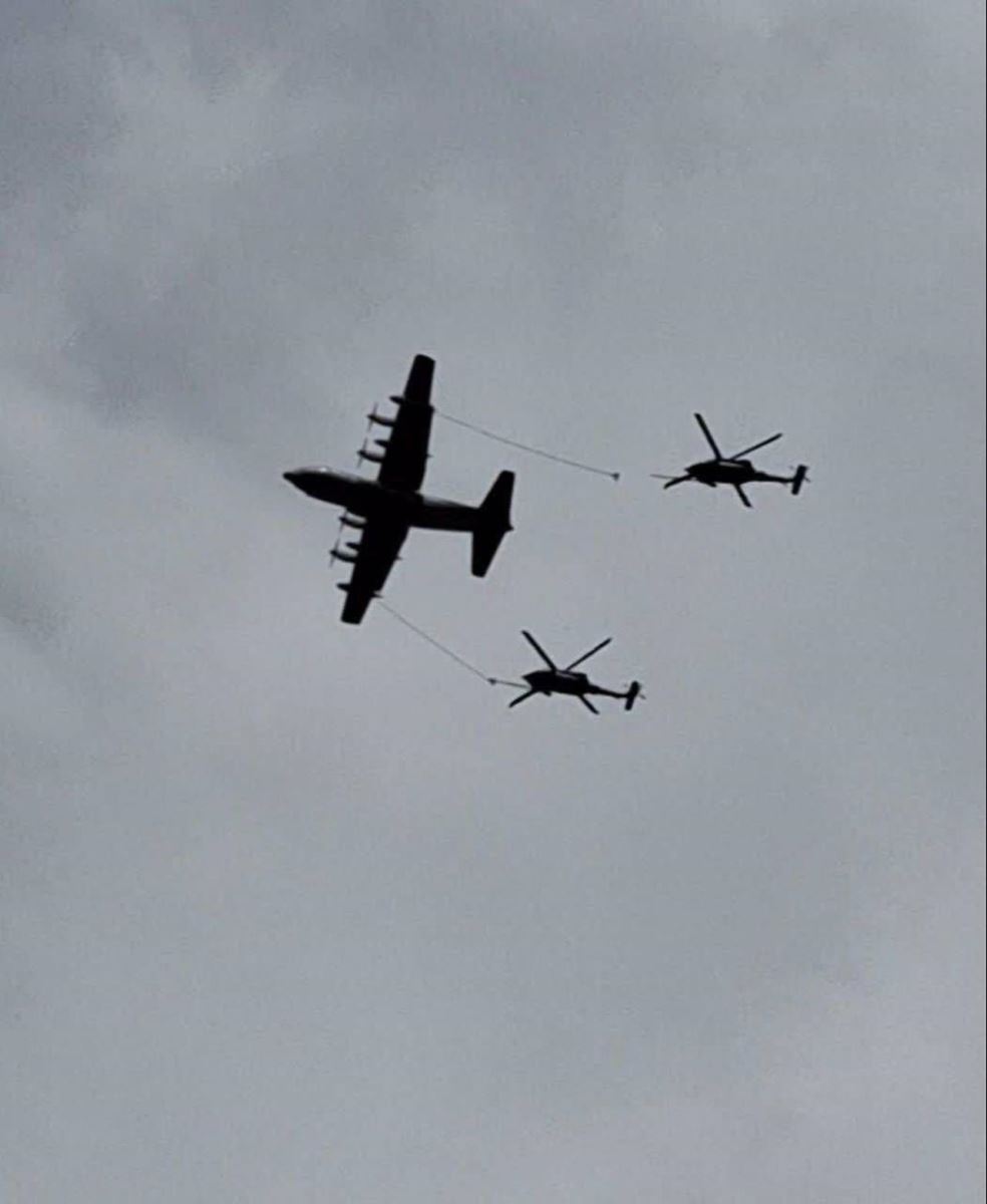 Hình ảnh một máy bay KC-130J Super Hercules đang tiếp nhiên liệu trên không cho hai trực thăng HH-60W Jolly Green II trên bầu trời Iran trong các hoạt động tìm kiếm - cứu hộ chiến đấu (CSAR) nhằm tìm kiếm các phi công F-15E Strike Eagle mất tích. Ảnh: Telegram