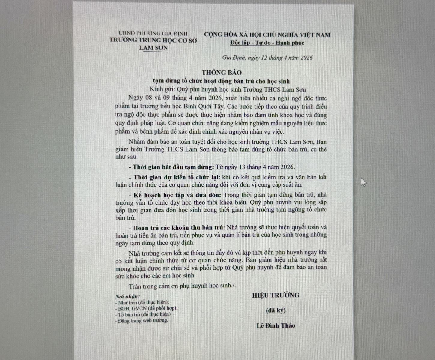 Theo đó, trong thông báo gửi đến phụ huynh, Ban Giám hiệu Trường THCS Lam Sơn (phường Gia Định, TP Hồ Chí Minh) cho biết, việc tạm dừng bán trú được triển khai ngay từ ngày 13/4/2026.