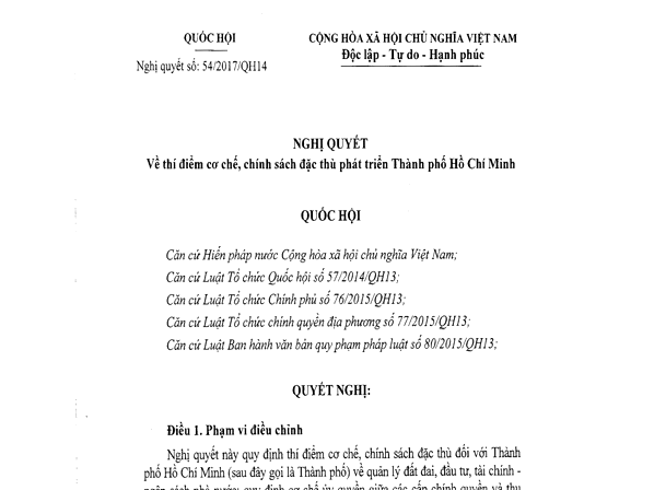 Trong gần 1 thập kỷ qua, Trung ương đã "mở đường" TP. Hồ Chí Minh với các Nghị quyết thí điểm về các cơ chế, chính sách đặc thù. Qua đó đã ghi nhận được những kết quả trong việc tháo gỡ một số điểm nghẽn về đầu tư, tài chính, phân cấp quản lý. Tuy nhiên, sau một thời gian dài áp dụng, các nghị quyết đặc thù đã bộc lộ nhiều vướng mắc.