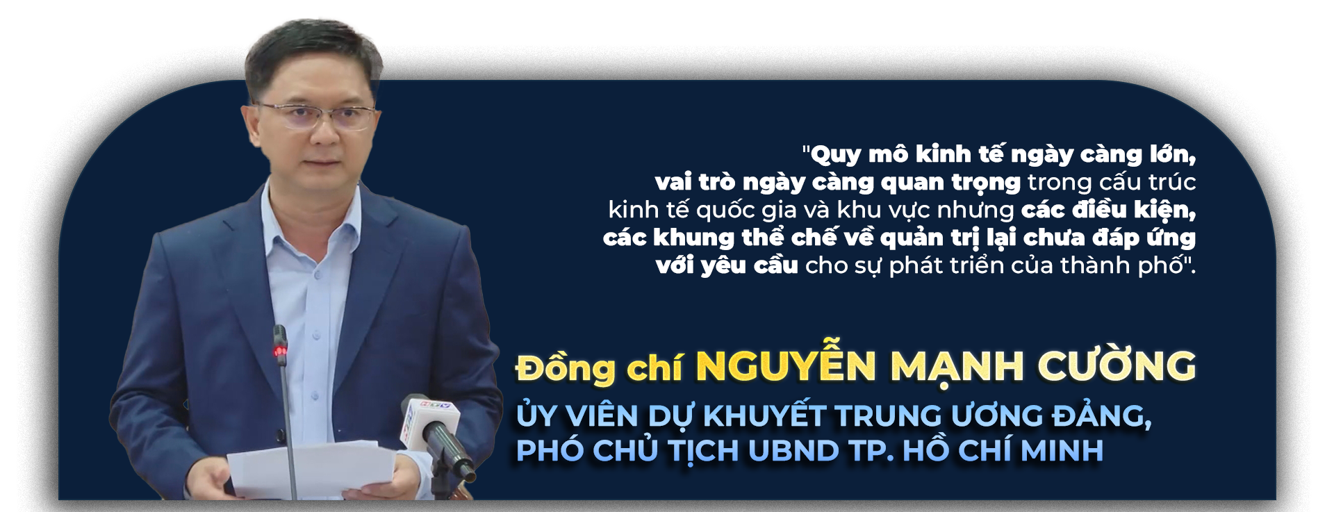 "Thành phố chúng ta cũng đối diện với một khó khăn điểm nghẽn đó là quy mô kinh tế ngày càng lớn, vai trò ngày càng quan trọng trong cấu trúc kinh tế quốc gia và khu vực nhưng các điều kiện, các khung thể chế về quản trị lại chưa đáp ứng với yêu cầu cho sự phát triển của thành phố. Các cơ chế quản lý hiện hành được thiết kế và được hoạch định trên cơ sở quản lý thành chính tập trung áp dụng chung cho phần lớn các địa phương chưa phản ánh được những đặc thù, tính chất, tầm vóc của một siêu đô thị đặc biệt là sau khi chúng ta thực hiện việc hợp nhất thành phố Hồ Chí Minh, Bình Dương và Bà Rịa - Vũng Tàu", đồng chí Nguyễn Mạnh Cường - Ủy viên dự khuyết Trung ương Đảng, Phó Chủ tịch UBND TP. Hồ Chí Minh cho biết.