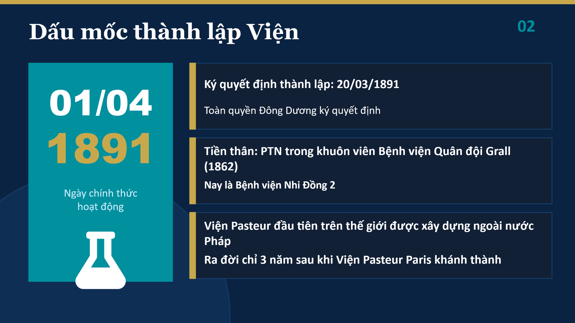 Theo tài liệu lịch sử, Viện Pasteur TP. Hồ Chí Minh được thành lập theo quyết định của Toàn quyền Đông Dương ngày 20/3/1891 và chính thức đi vào hoạt động từ ngày 01 tháng 4 năm 1891, là Viện Pasteur đầu tiên trên thế giới được xây dựng ngoài nước Pháp. Sự kiện này đánh dấu bước ngoặt quan trọng trong lịch sử phát triển của y học nhiệt đới và y tế dự phòng tại khu vực Đông Nam Á.