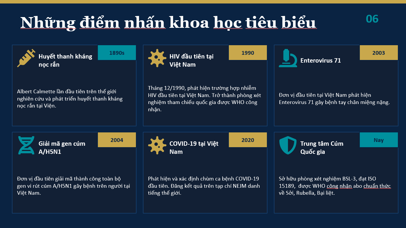 Nhiều thành tựu nổi bật của Viện đã góp phần quan trọng vào công tác bảo vệ sức khỏe cộng đồng, như phát hiện trường hợp nhiễm HIV đầu tiên tại Việt Nam, tham gia tích cực trong việc thanh toán bệnh bại liệt, loại trừ uốn ván sơ sinh, cũng như phát hiện và xác định các tác nhân gây dịch bệnh nguy hiểm, đặc biệt trong giai đoạn phòng chống đại dịch COVID-19.