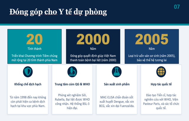 Bên cạnh đó, trong suốt hơn một thế kỷ hình thành và phát triển, Viện Pasteur TP. Hồ Chí Minh đã không ngừng lớn mạnh, khẳng định vị thế là một trong những đơn vị hàng đầu của cả nước trong lĩnh vực y tế dự phòng, nghiên cứu khoa học, đào tạo và cung cấp dịch vụ y tế dự phòng.