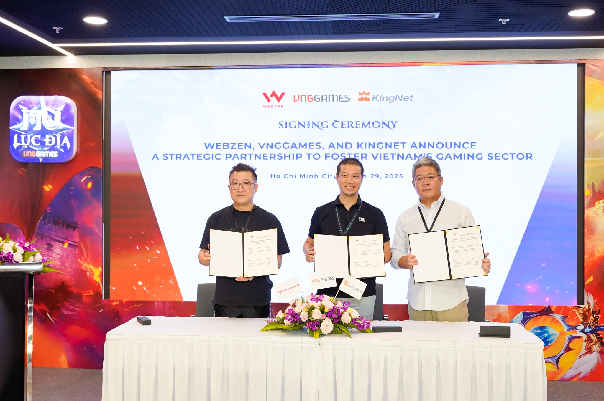 Từ trái sang: Ông Richard Yangki Song - Phó Chủ tịch Điều hành Webzen, Ông Lã Xuân Thắng - Giám đốc Phát hành tại Việt Nam VNGGames, Ông Zhao Fan - Giám đốc vận hành Kingnet